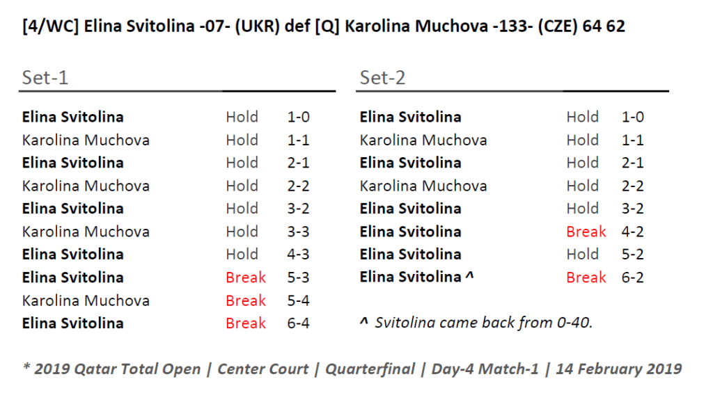 Fact, the scoreline of this Quarterfinal doesn’t reflect today’s quality of play. In reality, Elina Svitolina had to deliver UP to 22-year-old Muchova’s momentum and surging confidence. With a 1st-Round Bye and a quick win over Jelena Ostapenko yesterday, Svitolina had the legs to do it.