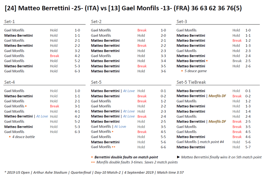 What a match! In just under 4-hours, hard-serving Italian Matteo Berrettini finally converted his 5th match point to reach his first Major Semifinal. The match should have been over at 5-3 in the 5th, but Berrettini dumped a double-fault on match point. Monfils rallied for the break.