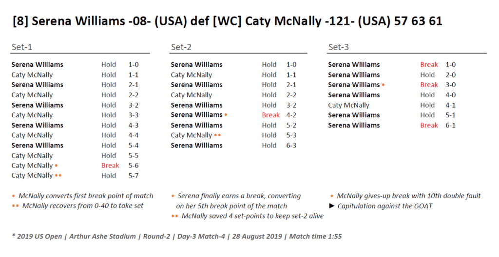 Unintimidated by the moment, the stadium, or her opponent – Caty stole set-1 from a 6-time US Open Champion; but faded after saving 4 set-points at the tail-end of set-2.