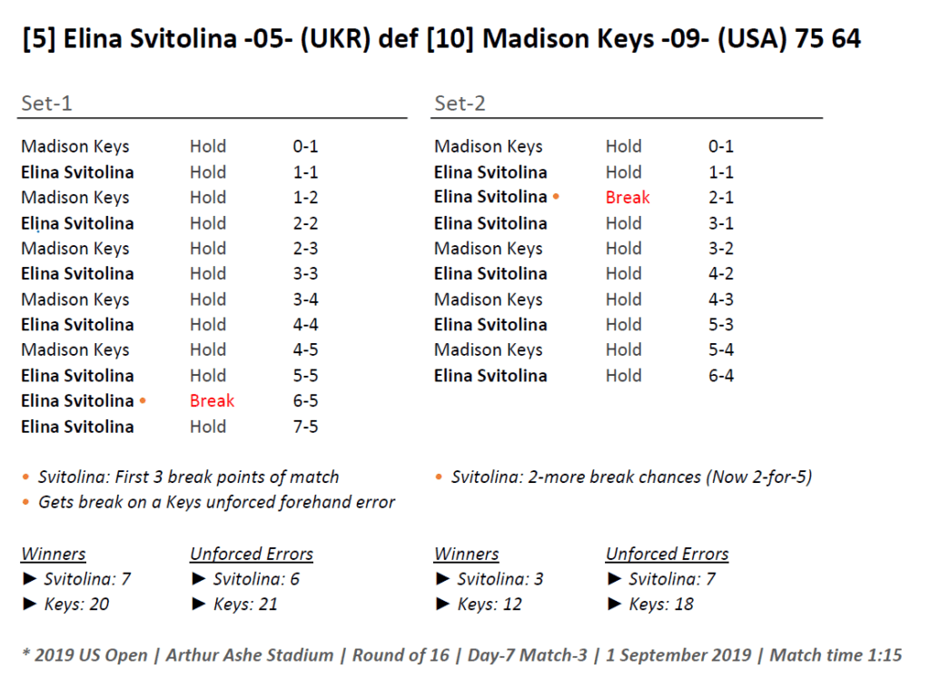 Tonight, both played to their strengths and delivered the stat-lines you’d expect. Lots of unforced errors with nearly an equal number of winners for Keys. Consistency and limited unforced errors from Svitolina, always ready to wear down her opponent through precise shot-placement.