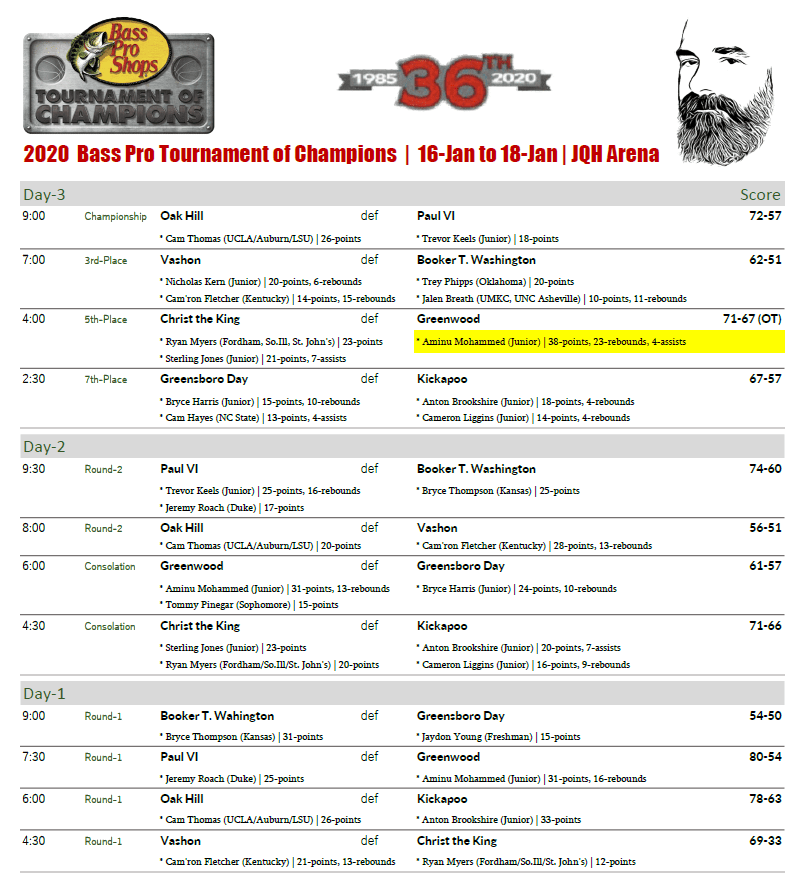 Against Paul VI, the 6’5″ Mohammed put up 31-points and grabbed 16-rebounds. He then scored 31-more with 13-boards versus North Carolina’s Greensboro Day School. In the 5th-place game Saturday afternoon, he capped the tournament with 38 points and 23-rebounds – breaking both the single game and tournament rebounding records. Easily the most prolific talent on court, Aminu wrapped the tournament with 100-points, 52-rebounds and 13-assists. With those numbers, even the tournament’s MVP finished a distant second.