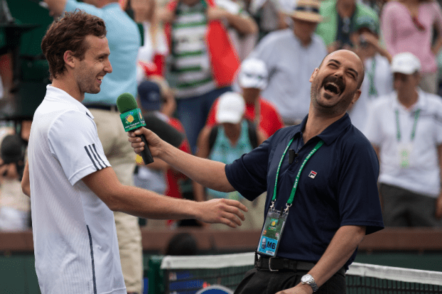 Undoubtedly, the highlight of Day 4 on Stadium-2 was Francesca Schiavone’s first win of 2014 – a 3-set fight with Germany’s Mona Barthel. Coming into Indian Wells, Francesca was 0-7 on the season with 1st-Round singles losses in Brisbane, Sydney, Melbourne, Paris, Doha, Rio de Janeiro and Florianopolis. Her reaction to the win rivaled her victory celebration after winning the title at Roland Garros in 2010…it has hilarious, actually. As we walked to center court for the post match interview, she stopped, knocked the clipboard from my left hand, grabbed by arm, and together we raised our fists in victory, jumping up and down, celebrating as if she’d just won the welterweight title. She was out of her mind. She told the crowd that she knew it was ridiculous to be THAT excited for a 1st-Round win, but it’d been a frustrating first two months of the season. (She would go on to lose in the 3rd Round to Australia’s Sam Stosur)