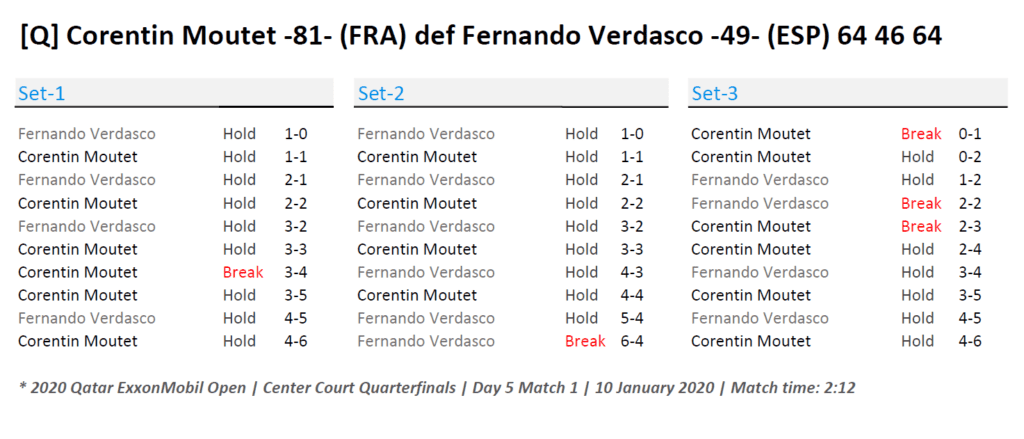 Thursday’s rain completely derailed the 2020 Qatar ExxonMobil Open schedule. Yesterday, thunderstorms washed-out three of the four Quarterfinals, including this one.