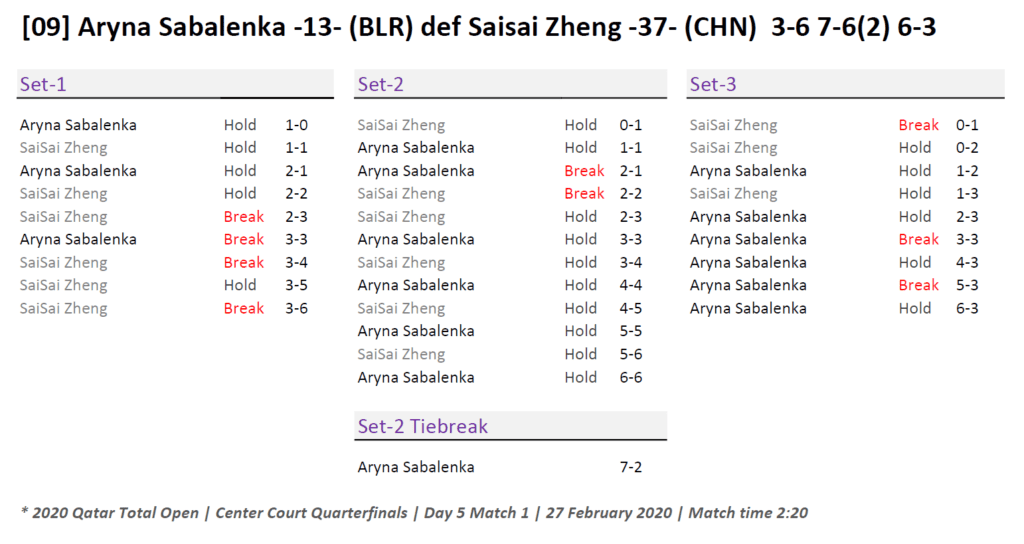 - QF — L | [9] Aryna Sabalenka -13- (BLR) | Score: 6-3, 6-7(2), 3-6