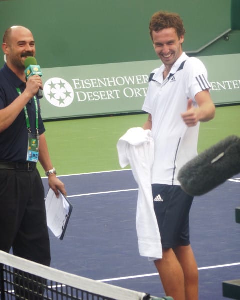 The third match on Stadium-2 was Tuesday’s highlight: Grigor Dimitrov vs. Ernests Gulbis. It was their third meeting in the past month. Gulbis got the best of Grigor in Rotterdam’s Round of 16 (6-4, 7-6). Grigor defeated Ernests two weeks ago en-route to his second career title in Acapulco (4-6, 7-6, 7-5). Yesterday, Ernests outlasted Grigor 2-6, 6-1, 7-5. The third was a hell of a set, featuring – as expected – flared tempers and smashed raquets. At 2-3 advantage Dimitrov, Gulbis received a time-violation warning. It appeared as if the wheels were about to come off for Ernests, but he delivered an unreturnable serve, then evened the set. The winning moment came at 5-all, with a clutch break from Gulbis. He went on to win the set and match 7-5. Afterwards, Ernests said he had to beat this younger guy now because young Grigor is on his way up and Ernests is on his way down, already an old man at 25. I told him he was full of it…those words were in stark contrast to his comments after winning Marseille last month, where he claimed his focus is still on becoming World #1. He then offered me a job as his motivational coach. When asked if he’d smash the rest of his raquets and hand them out to adoring fans, he declined, but said the chair umpires need to be a little more lenient and allow some emotion on the court. It’s great for “the show.” (Thumbs-up for Mohammed Layani). [Great take on the match from Steve Tignor]
